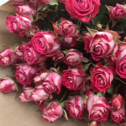 оранжевые кустовые розы – 13 шт. Открыточка с вашими пожеланиями – 1 шт. Упаковка дизайнерская – 3 шт.