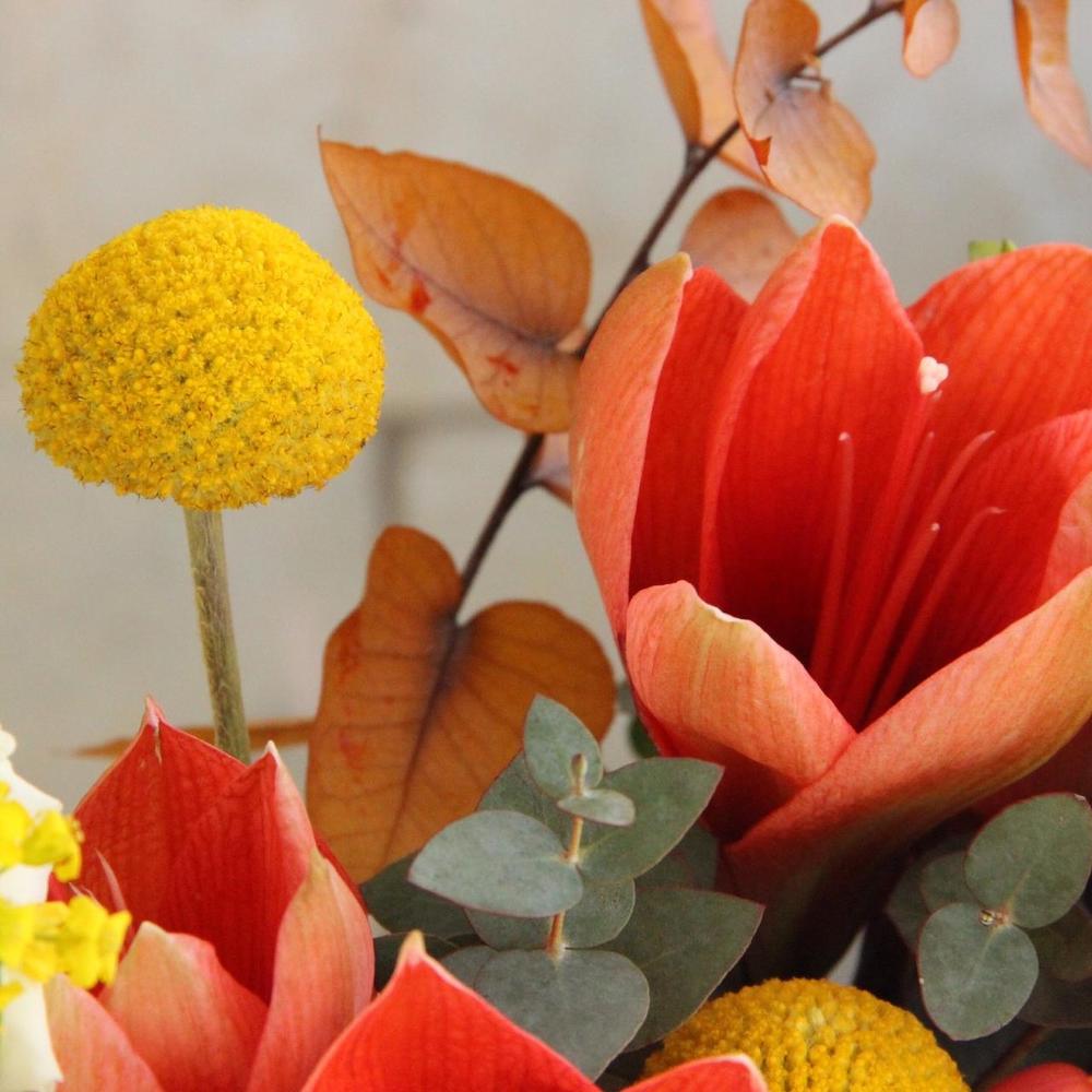Авторский букет с амариллисами, пионовидными розами, краспедией, хиперикумом, лизиантусом и эвкалиптом.Стильное цветочное решение для любого случая