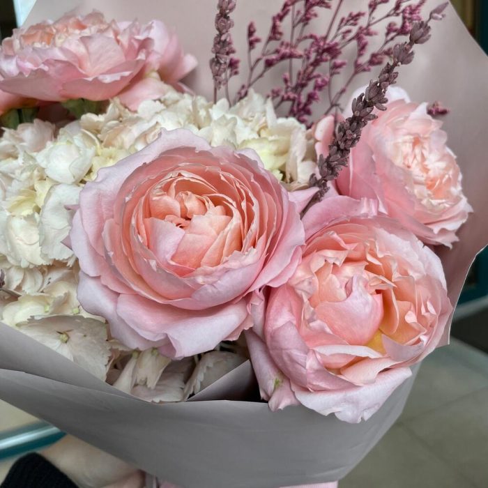 Альстромерии, Гвоздики, Кустовые розы, Лизиантусы, Розы, Хризантемы