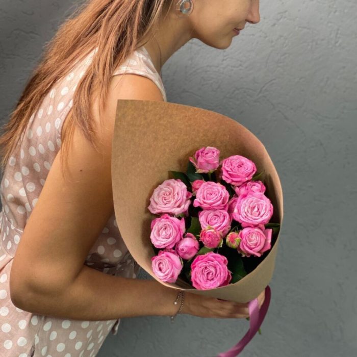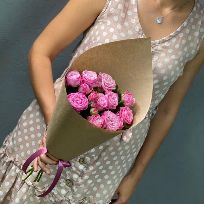 Пионовидная кустовая роза – 5 шт. Открыточка с вашими пожеланиями – 1 шт. Упаковка дизайнерская – 1 шт.