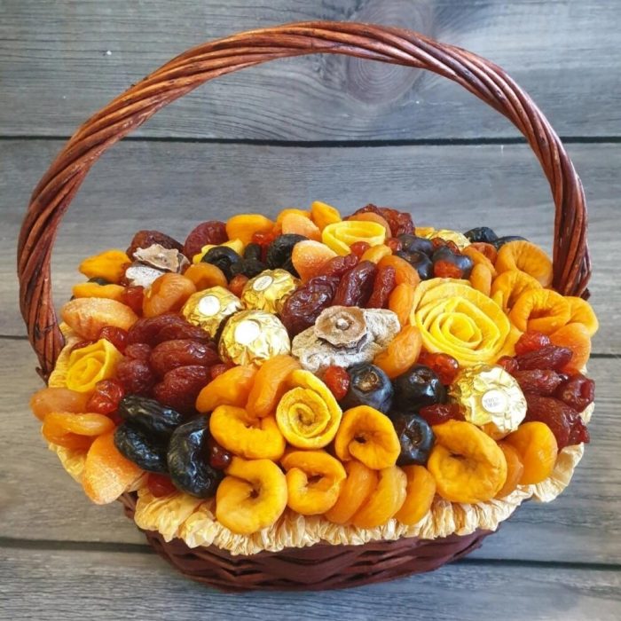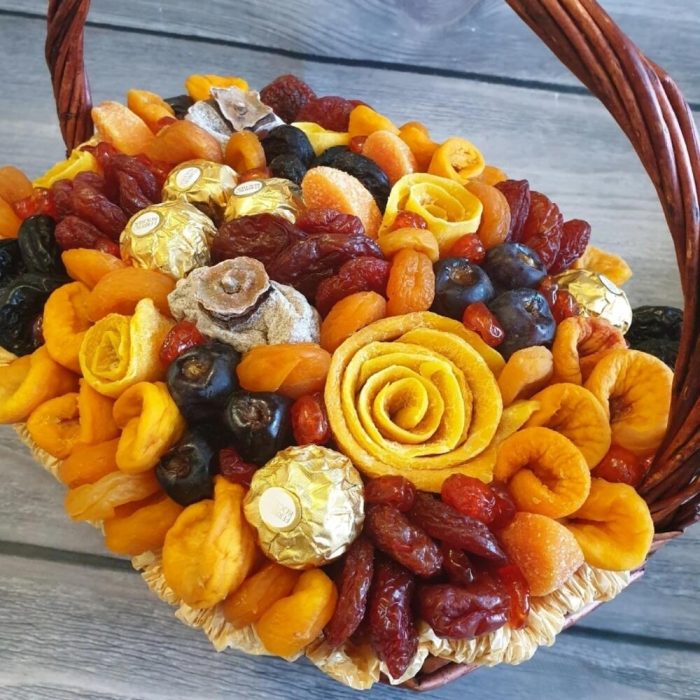 Курага – 150 гр.Чернослив – 200 шт.Вишня вяленая – 50 гр.Финики – 9 шт.хурма вяленая – 2 шт.персик вяленый – 200 гр.конфеты шоколадные с орешками – 5 шт.роза из манго – 1 шт.красная слива – 250 гр.