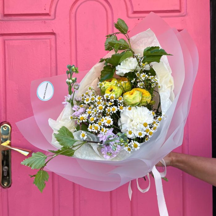 Маттиола – 2 шт.Лента атласная – 1 шт.Тишью – 1 шт.Диантус – 2 шт.Ветки березы – 2 шт.Аквапак – 1 шт.Матрикария (Ромашка Камила) – 3 шт.Корейская пленка – 3 шт.Инструкция по уходу – 1 шт.транспортировочная упаковка – 1 шт.кустовая садовая роза – 1 шт.