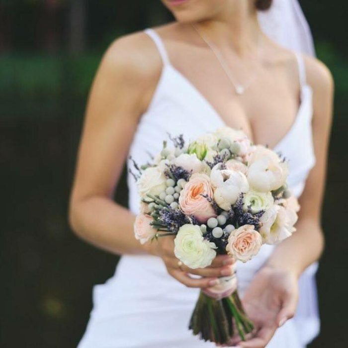 Пионовидная роза – 9 шт.Кустовая роза – 5 шт.Ранункулюс – 7 шт.Бруния – 3 шт.Лаванда – 30 шт.Тюльпан – 4 шт.Лента атласная – 1 шт.Лента бархатная – 1 шт.