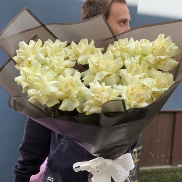 Бомбический букет из белых роз в стильном оформлении станет замечательным подарком для ваших близких