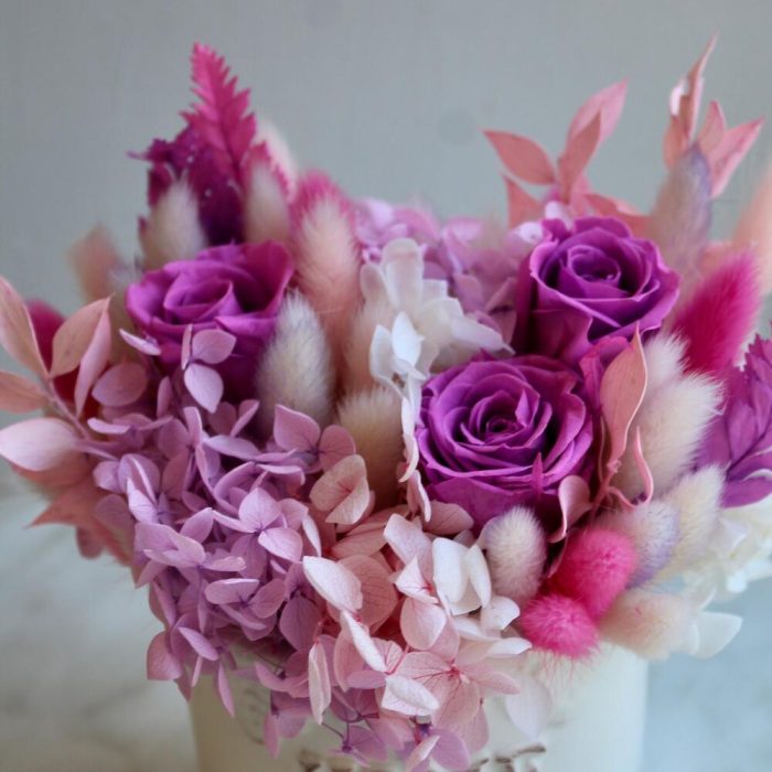 Роза одноголовая – 3 шт.Гортензия – 1 шт.пушистики – 1 шт.Керамическое кашпо – 1 шт.