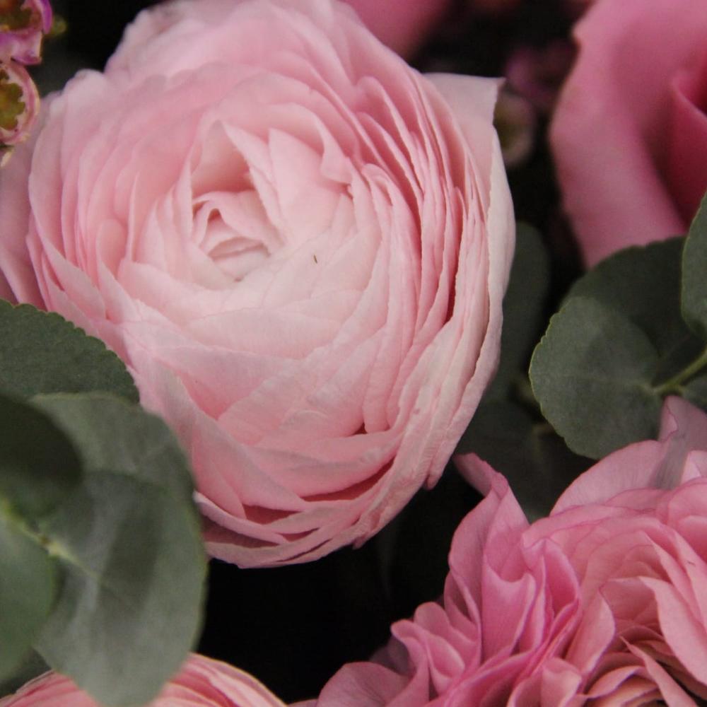 Пион – 3 шт.Роза сортовая – 9 шт.Ранункулюс – 5 шт.Диантус – 5 шт.Ваксфлауэр – 3 шт.Эвкалипт – 7 шт.Коробка шляпная – 1 шт.Оазис – 1 шт.Тишью – 2 шт.