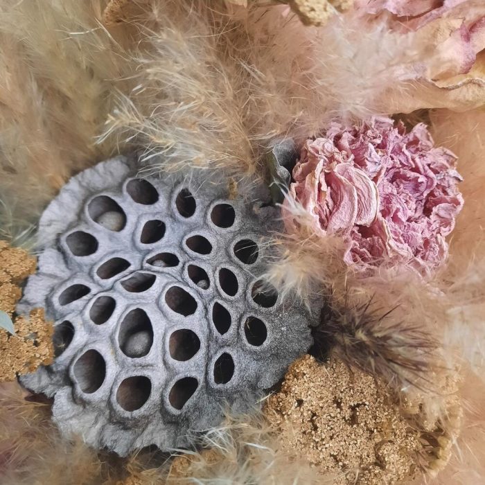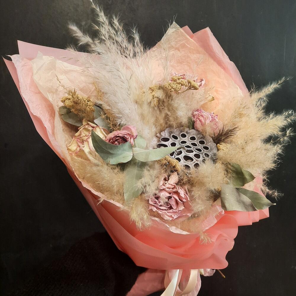 Эвкалипт – 2 шт.Лента атласная – 4 шт.Тишью – 2 шт.Калька – 2 шт.Роза сухоцвет – 3 шт.Тысячелистник – 9 шт.Лотос сухой – 1 шт.кортадерия – 1 шт.пион сухоцвет – 2 шт.