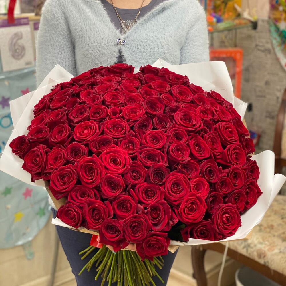 розы эквадор (60 см) – 101 шт.Крафт упаковка – 2 шт.Лента атласная – 1 шт.