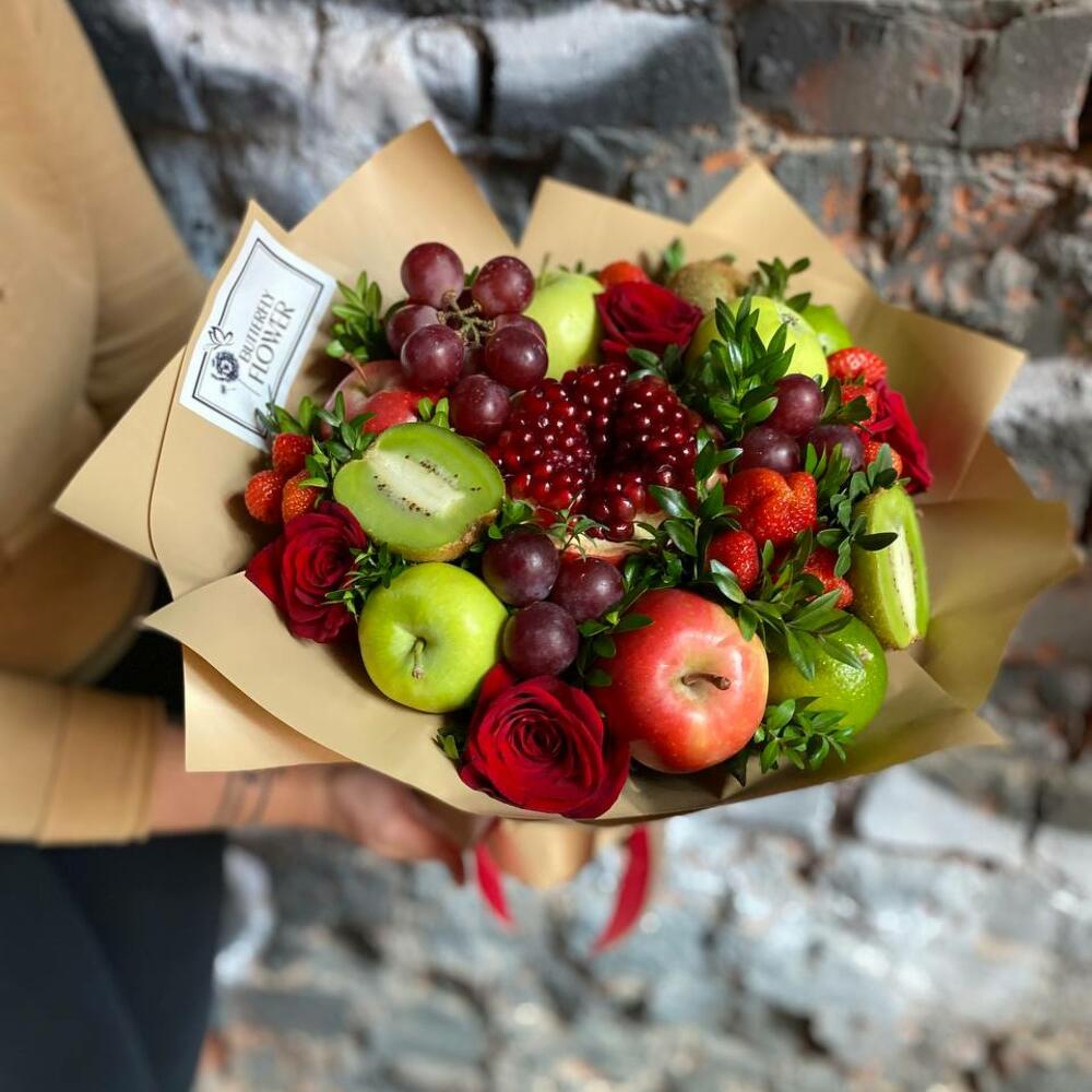 Насыщенный яркий букет из свежих цветов и фруктов премиум-качества, это настоящая находка для тех, кто хочет сделать праздник незабываемым