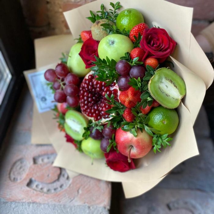 Клубника – 5 шт.Лента атласная – 1 шт.Гранат – 1 шт.Киви – 2 шт.Яблоко – 4 шт.Крафт – 1 шт.Лайм – 1 шт.Роза Кенийская 40 см – 5 шт.Нобилис – 1 шт.Виноград гроздь – 1 шт.