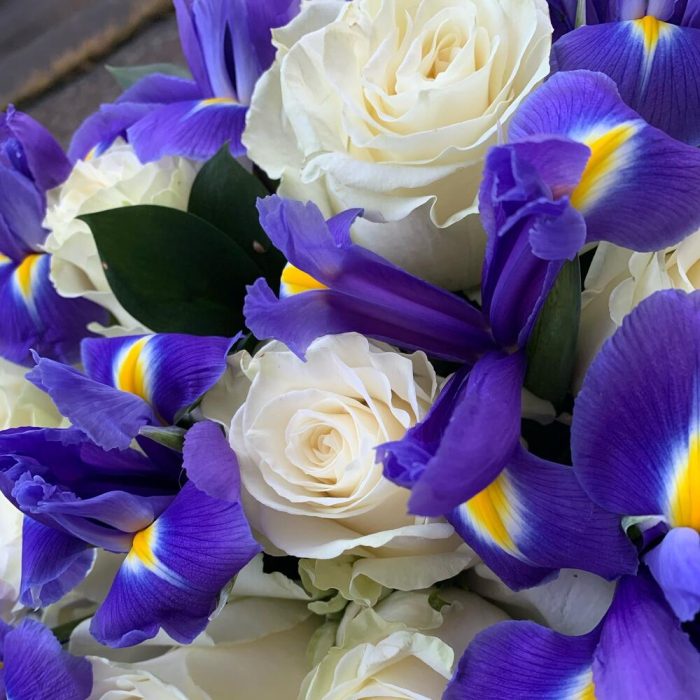 Ирис – 16 шт.Рускус – 10 шт.Роза – 21 шт.Оазис – 1 шт.Шляпная коробка – 1 шт.