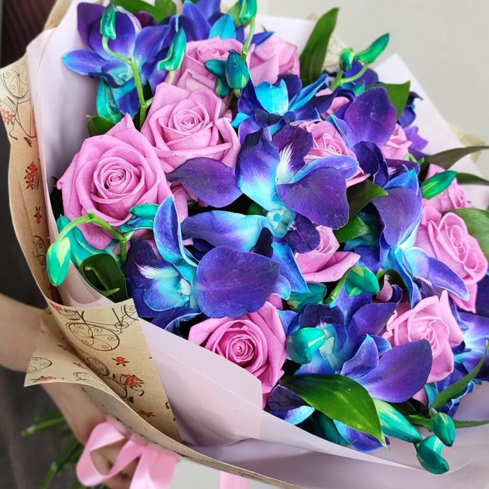 На фоне элегантных роз выделяется глубокий и невероятно красивый оттенок синих орхидей. Сочная зелень рускуса создаёт законченный образ данной композиции.Великолепный букет, который наши флористы с любовью соберут для Вас, символизирует изысканность и благородство, передает чувство восхищения и нежных эмоций, которые Вы непременно испытаете. Размер и вид этого букета подчеркнут Вашу щедрость.На языке цветов букет скажет о Вашей симпатии и надежде на дальнейшие отношения. Но и для подарка подруге, маме, дочке – это тоже отличный выбор!К каждому заказу прилагается инструкция по уходу за цветами + подкормка для цветов от мирового бренда Chryzal + любовь флориста. Мы искренне стараемся, чтобы у наших клиентов появилось желание купить следующий букет именно в нашем магазине.