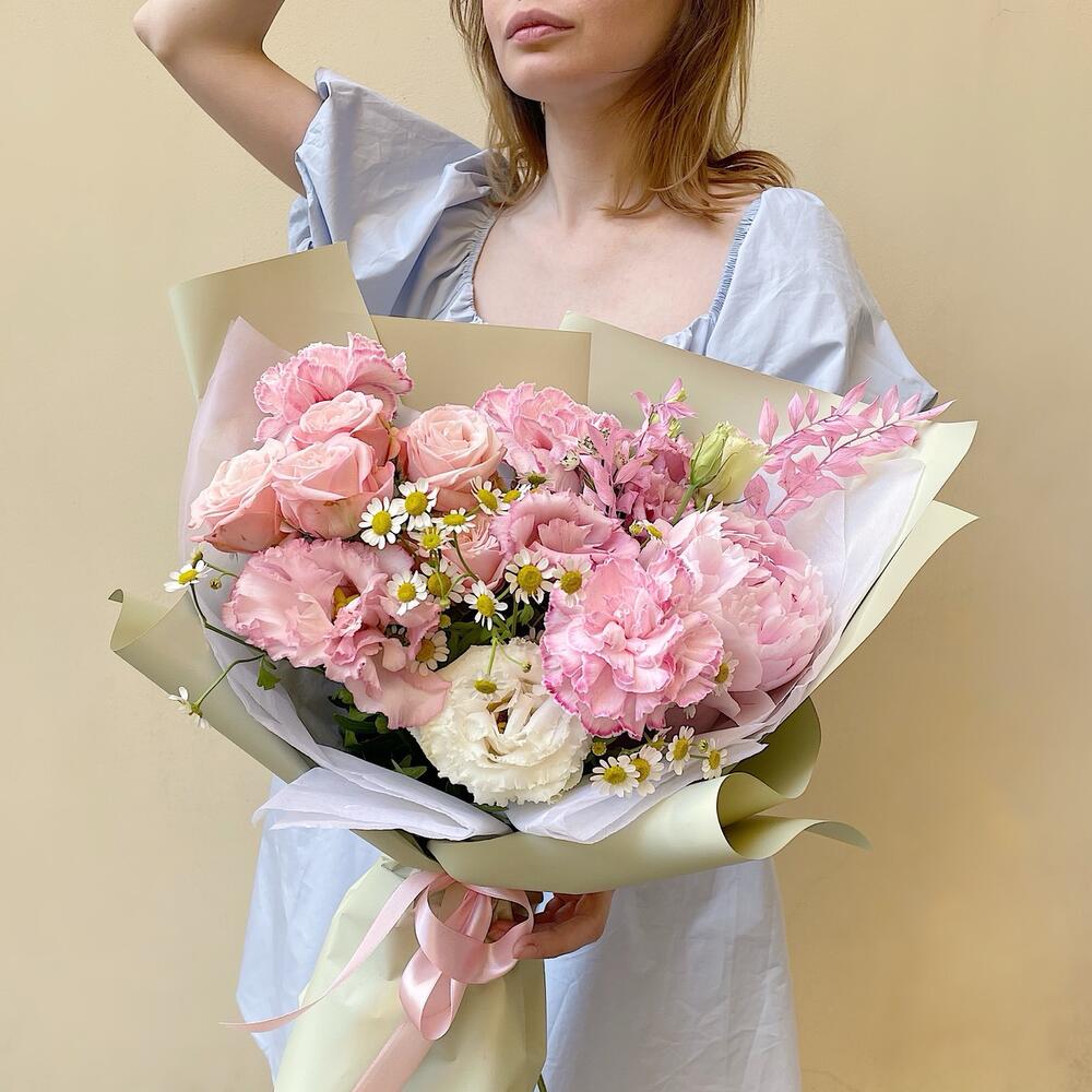 Категорий: Гвоздики, Кустовые розы, Лизиантусы, Пионовидные розы, Розы, Ромашки