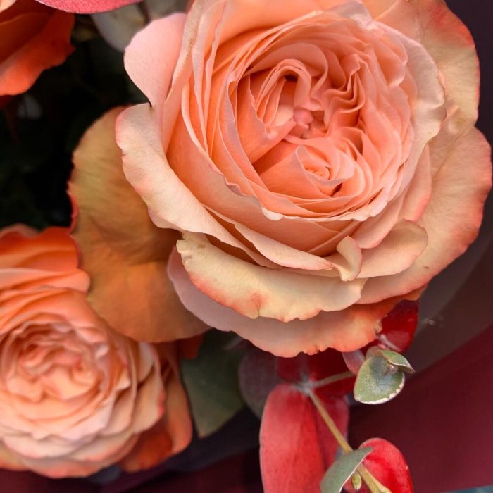 кахала роза пионовидная – 3 шт.Эрингиум синий – 1 шт.эустома персиковая – 1 шт.Эвкалипт – 1 шт.