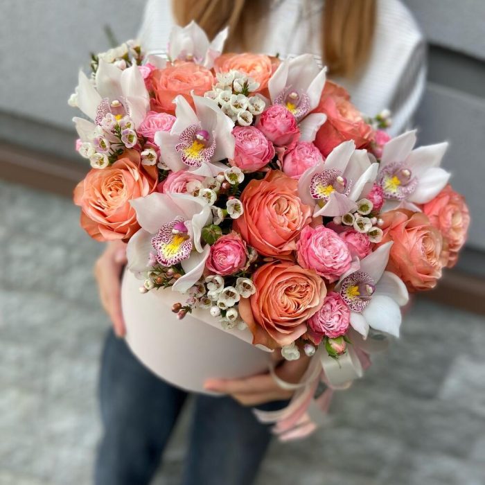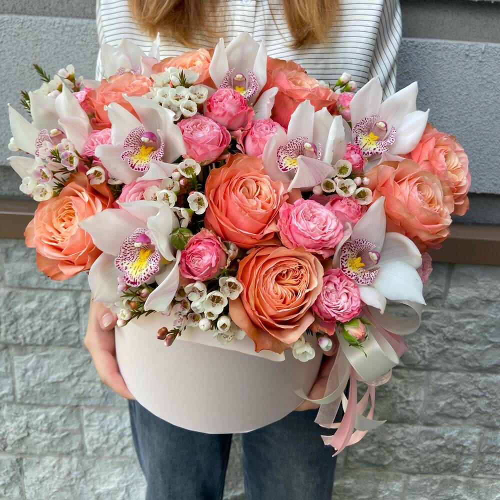 Роза кахала – 12 шт.Орхидея Цимбидиум – 8 шт.Ваксфлауэр – 4 шт.Роза кустовая пионовидная – 6 шт.Лента атласная – 3 шт.Коробка шляпная – 1 шт.Оазис флористический – 2 шт.