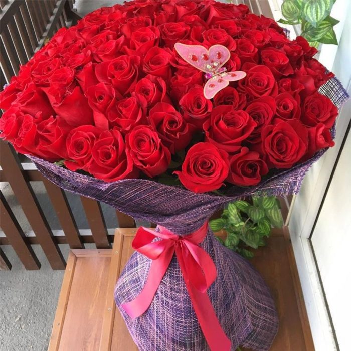 Роза фридом 100 см – 101 шт. Упаковка Джут – 1 шт. Лента шелковая – 1 шт. Декоративная бабочка – 1 шт.