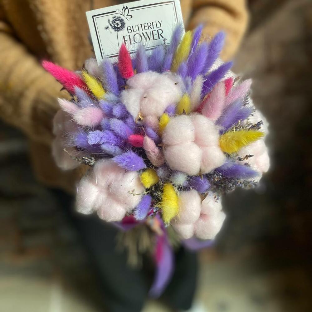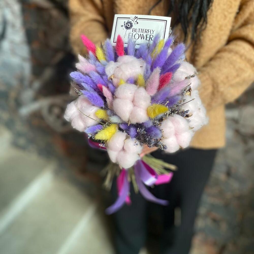 Букет из сухоцветов – лагуруса, лаванды и хлопка «Радуга в облаках»