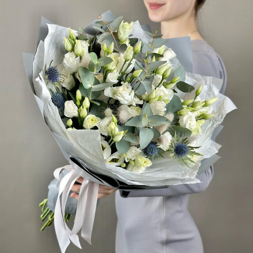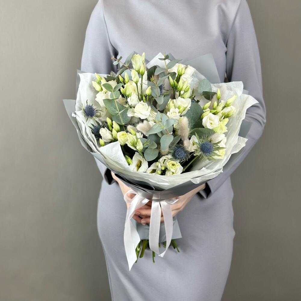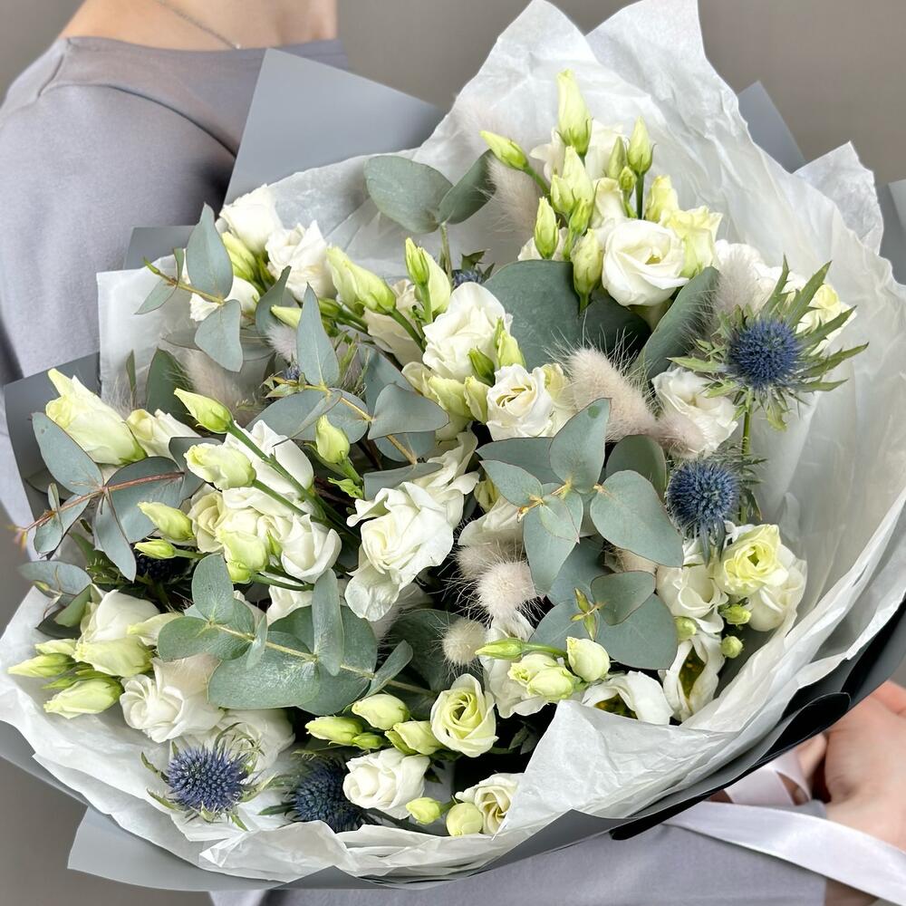 Эрингиум – 3 шт.Лента атласная – 1 шт.Лагурус – 15 шт.Дизайнерская упаковка – 2 шт.эустома ду росита белая – 7 шт.