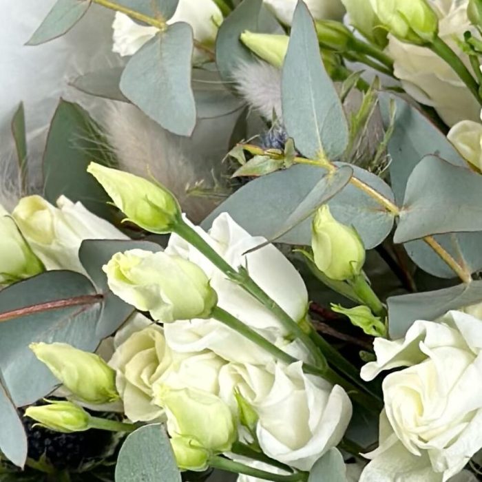 Букет с эустомой, эрингиумом, лагурусом и эвкалиптом