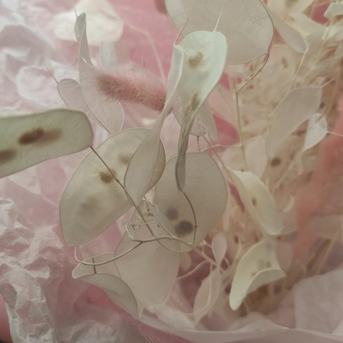 лунария стабилизированная банч – 1 шт.Лагурус (сухоцвет) – 6 шт.камыш декоративный – 2 шт.Тишью – 2 шт.сетка мерцающая – 1 шт.Упаковка дизайнерская – 2 шт.