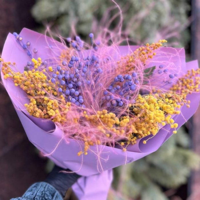 мимоза сухоцвет – 5 шт.лëн сухоцвет – 5 шт.ковыль пучок – 5 шт.Упаковка дизайнерская – 4 шт.Лента атласная – 1 шт.