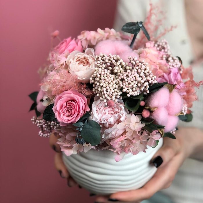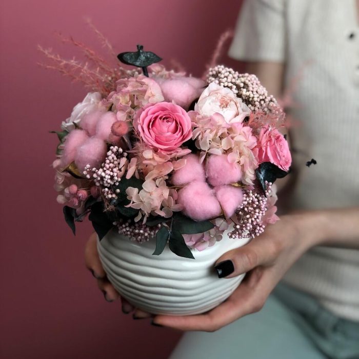Ваза керамика – 1 шт.цветы стабилизированные микс – 15 шт.Озотамнус – 3 шт.Хлопок – 4 шт.