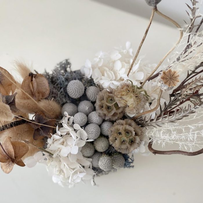 Скабиоза стелата – 3 шт.Лагурус (сухоцвет) – 10 шт.Фритиллярия – 1 шт.Ковыль – 1 шт.Бруния сильвер – 1 шт.гортензия стабилизированная – 1 шт.Мох стабилизированный – 1 шт.сухоцветы микс – 2 шт.Кашпо керамическое – 1 шт.Оазис флористический – 1 шт.