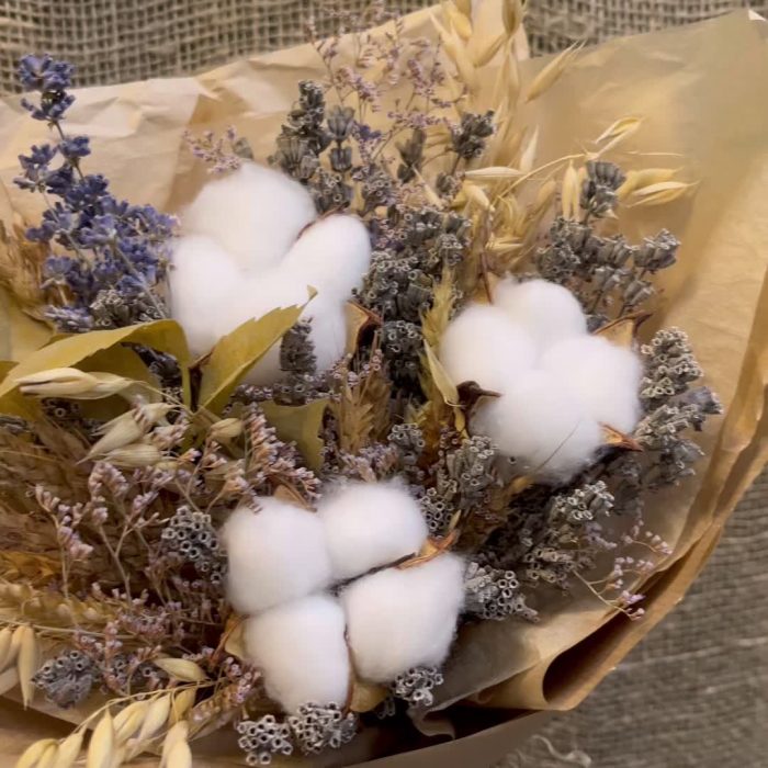 Лимониум – 1 шт.Тишью – 1 шт.Пшеница (сухоцвет) – 17 шт.бечевка натуральная – 1 шт.овес сухоцвет – 7 шт.хлопок белый – 3 шт.лаванда крымская – 1 шт.крафт натуральный – 1 шт.листья искуственные – 2 шт.лаванда садовая – 1 шт.
