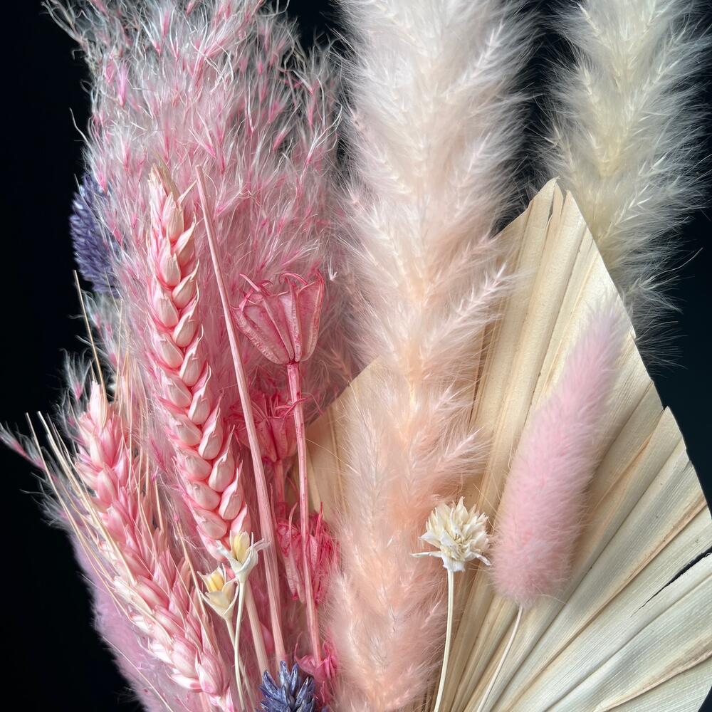 лист пальмы сухоцвет – 1 шт.Лагурус (сухоцвет) – 3 шт.пампас мини сухоцвет – 3 шт.пампас – 1 шт.фаларис сухоцвет – 4 шт.Нигелла сухоцвет – 3 шт.