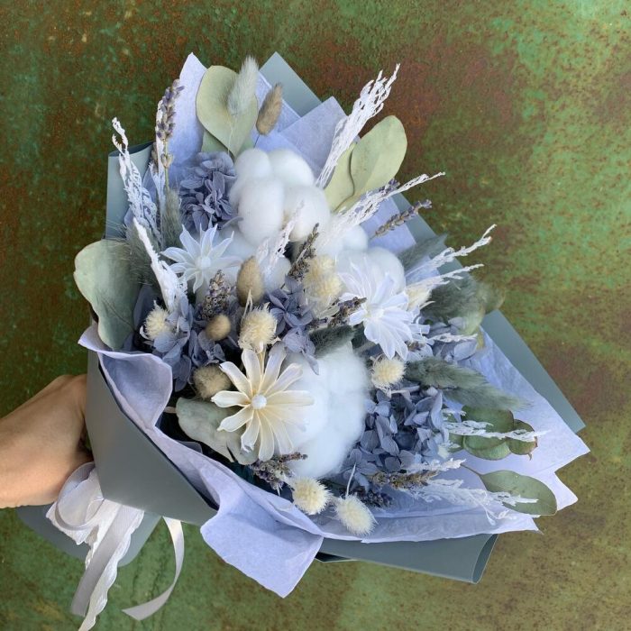 Хлопок – 4 шт.цветы – 5 шт.гортензия серая – 5 шт.Лагурус – 12 шт.Лаванда – 17 шт.лимониум стабилизированный – 2 шт.эвкалипт натуральный сухой – 5 шт.Эрингиум белый – 1 шт.Тишью белое – 1 шт.Пленка матовая – 1 шт.ленты атласные – 2 шт.