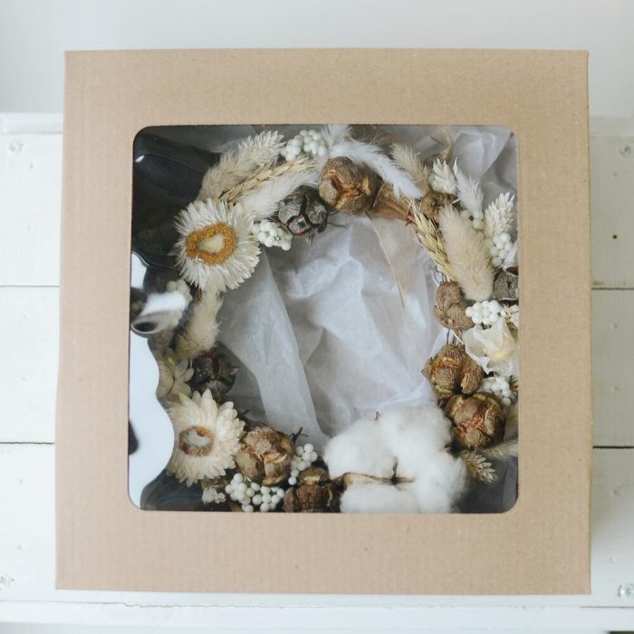 Основа для венка – 1 шт.Хлопок – 1 шт.сухоцветы микс – 1 шт.ветка искусственная белая – 1 шт.Тишью – 1 шт.Коробка – 1 шт.