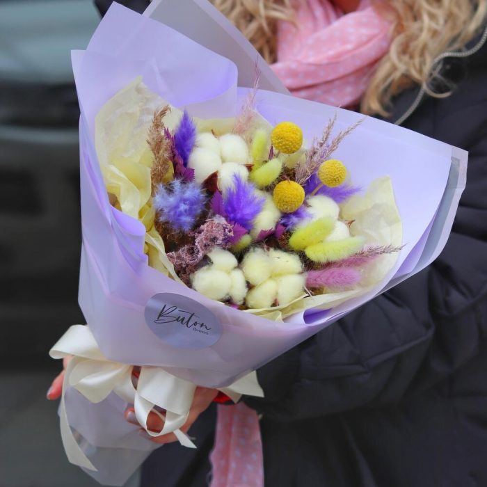 Хлопок (сухоцвет) – 5 шт.Краспедия – 3 шт.Сетария – 3 шт.Лагурус – 7 шт.Папоротник – 1 шт.Открыточка с вашими пожеланиями – 1 шт.Шоколадка – 1 шт.