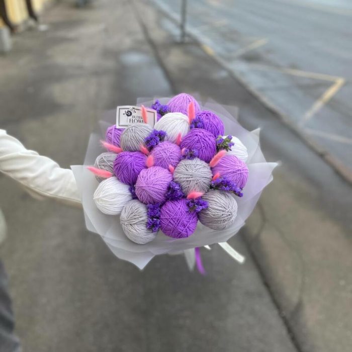 Зимний букет из клубков пряжи, лагуруса и статицы в стильной упаковке “Меринос”