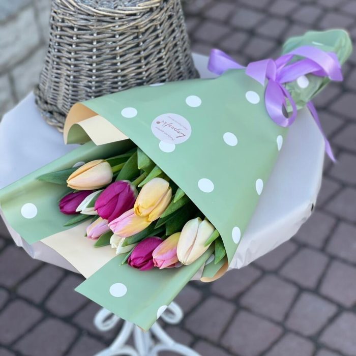 Гвоздики, Лизиантусы, Розы, Тюльпаны
