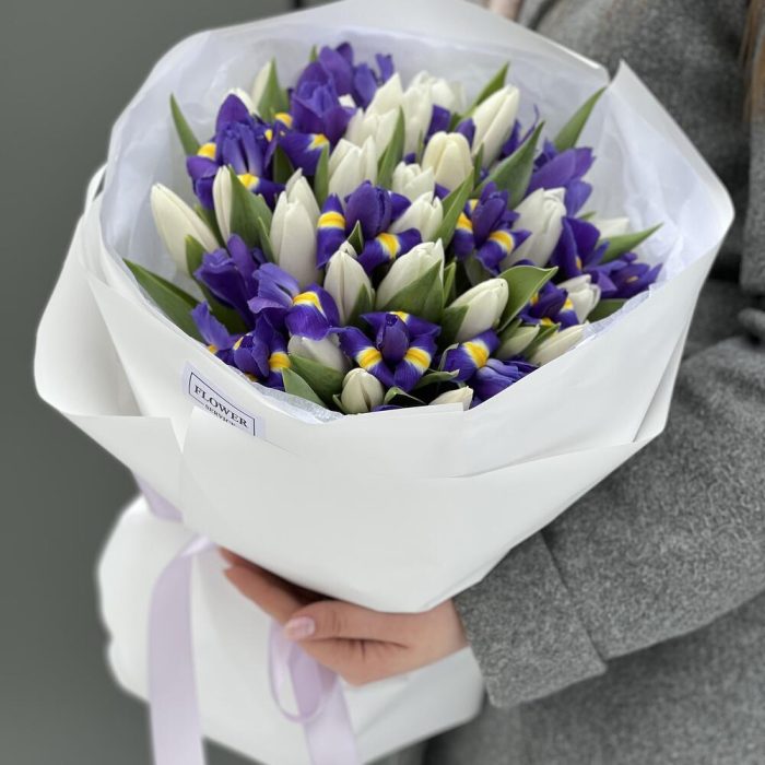 Букет из белых тюльпанов и синих ирисов!