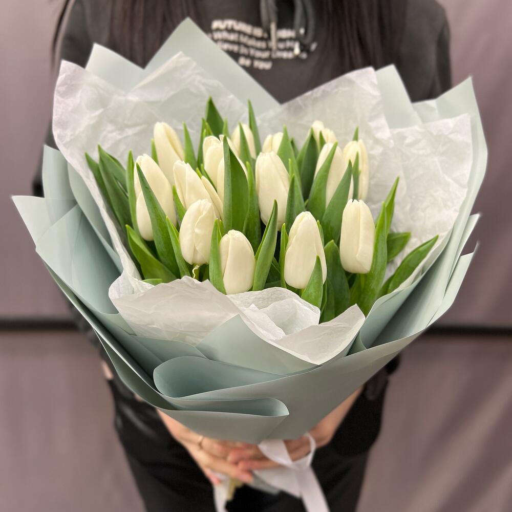 Лента атласная – 2 шт.Тишью – 2 шт.Тюльпан белый – 15 шт.Пленка матовая – 4 шт.