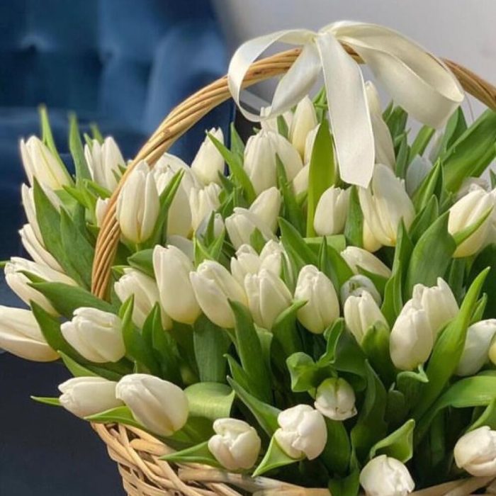 тюльпаны белые – 51 шт.Корзина плетеная – 1 шт.Лента атласная – 1 шт.Открытка – 1 шт.хорошее настроение – 100 шт.инструкция по уходу за цветами – 1 шт.Кризал – 1 шт.